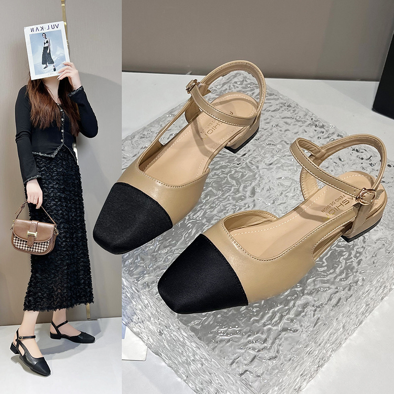 小香风拼色法式包头凉鞋女2025年新款女夏平底后空复古方头女单鞋