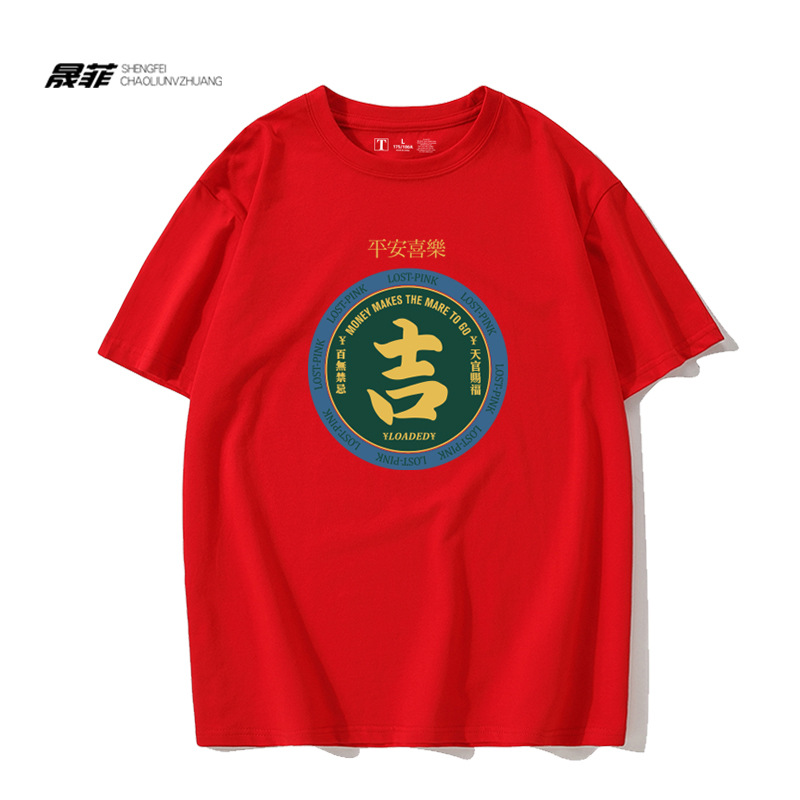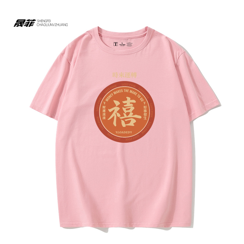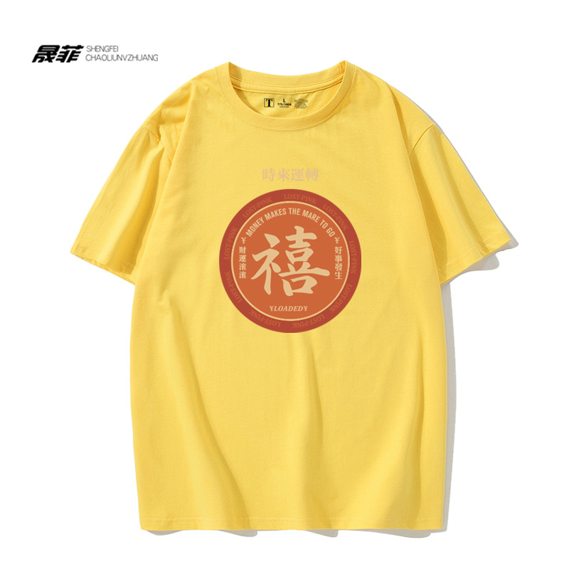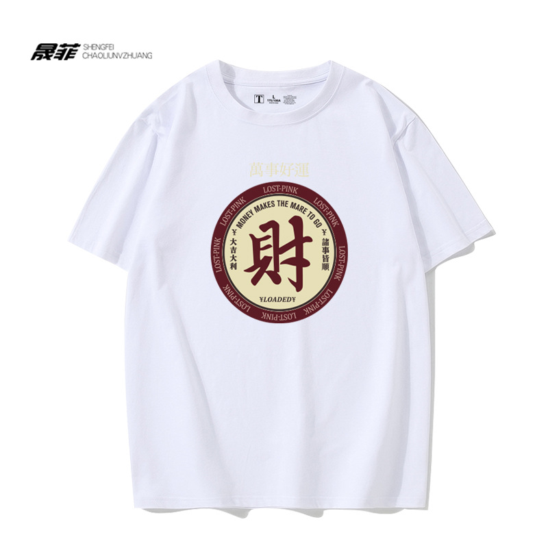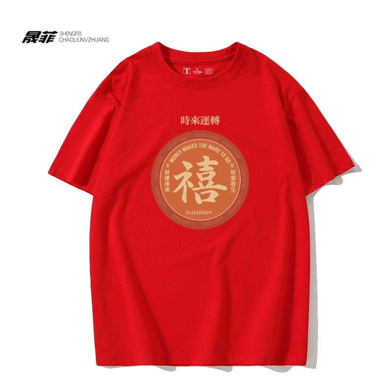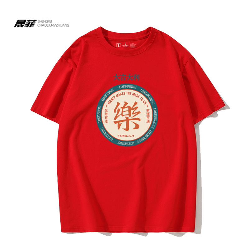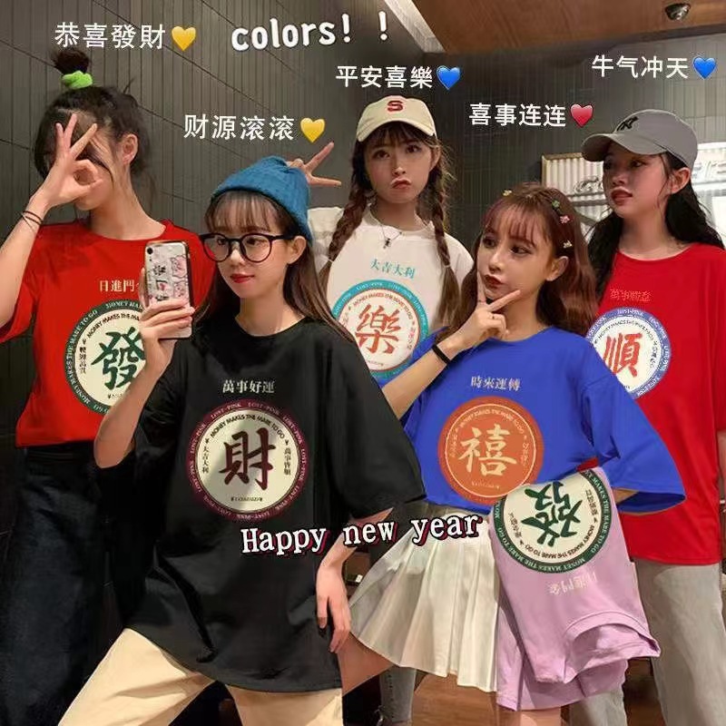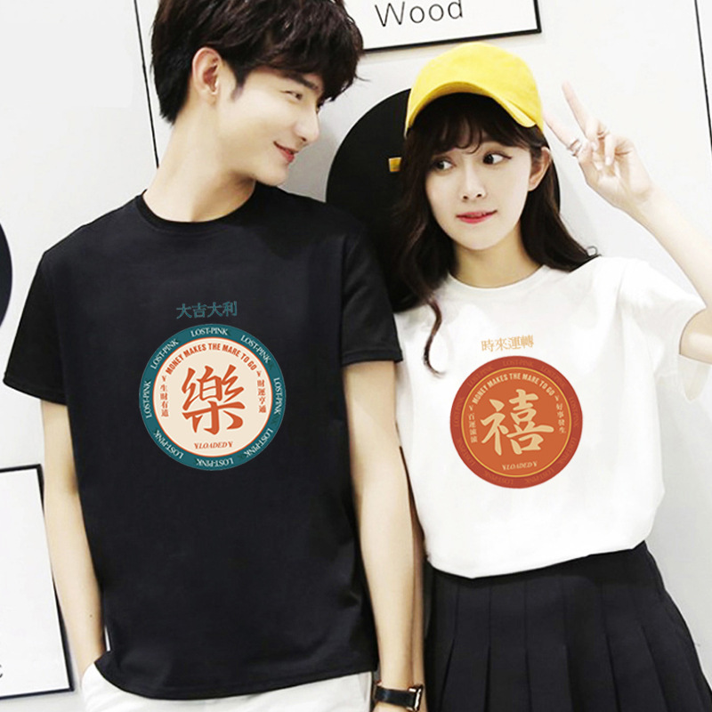 新款国潮短袖发财喜乐纯棉t恤女宽松大码情侣上衣闺蜜团队服装