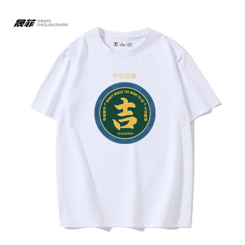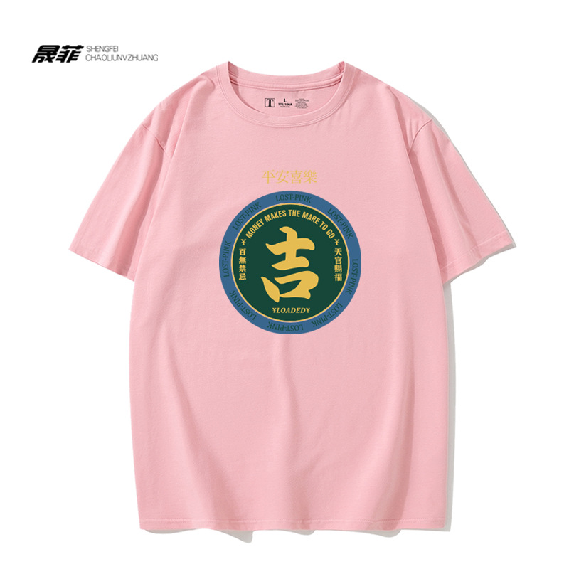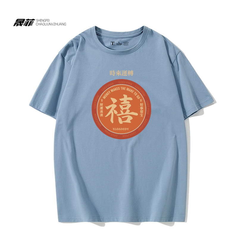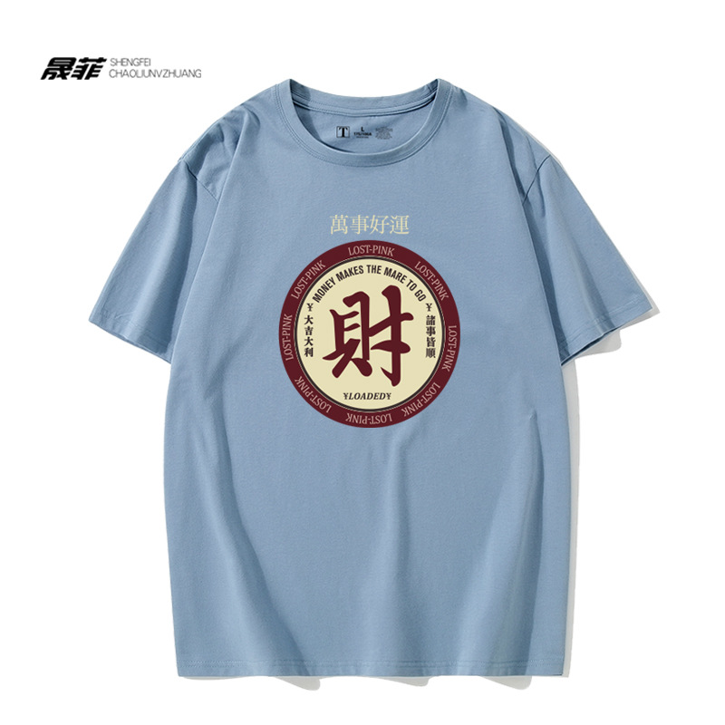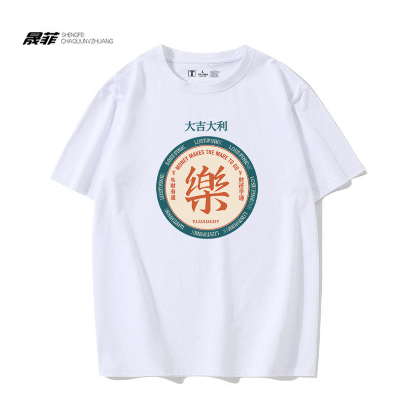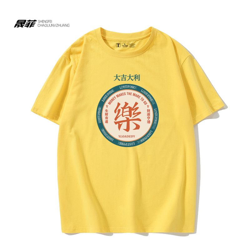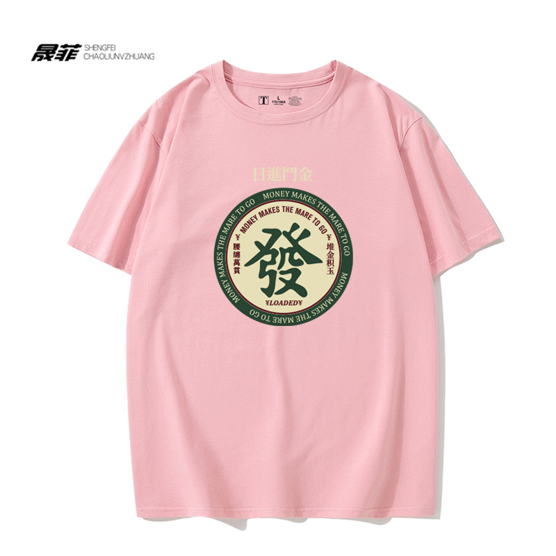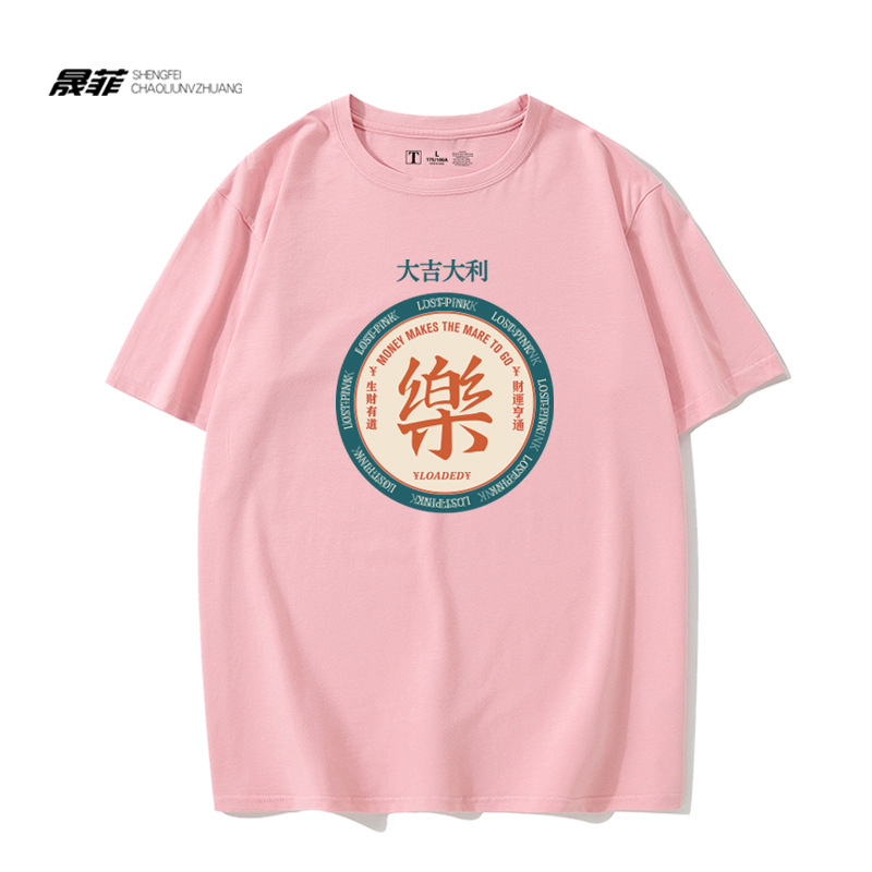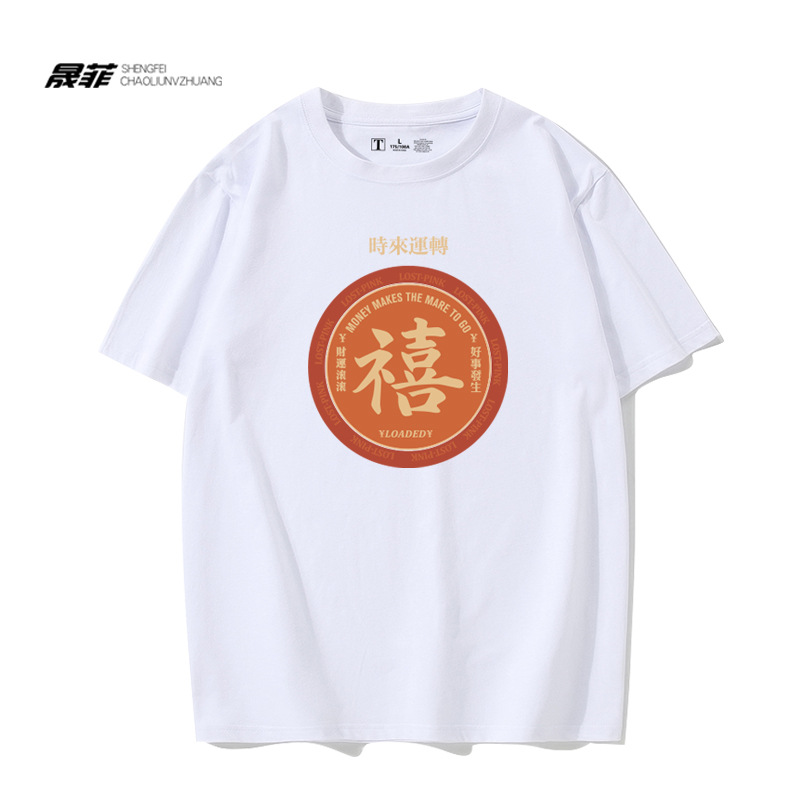 新款国潮短袖发财喜乐纯棉t恤女宽松大码情侣上衣闺蜜团队服装