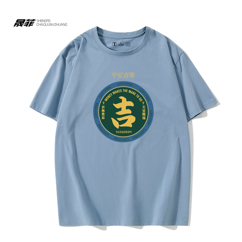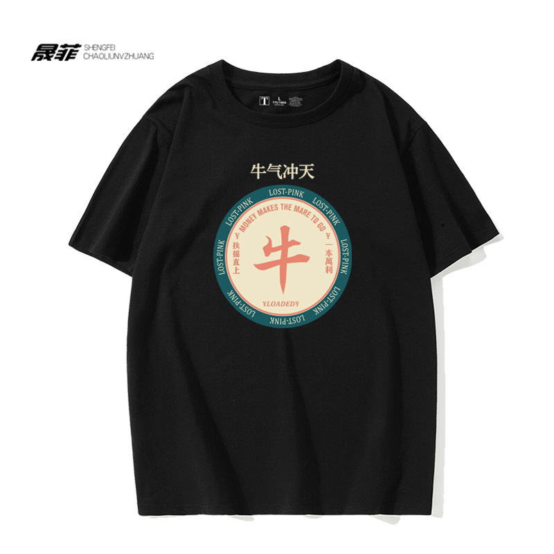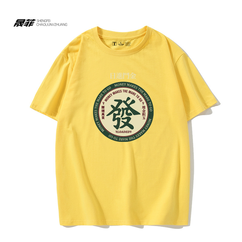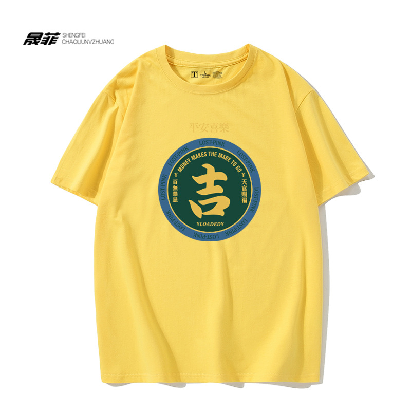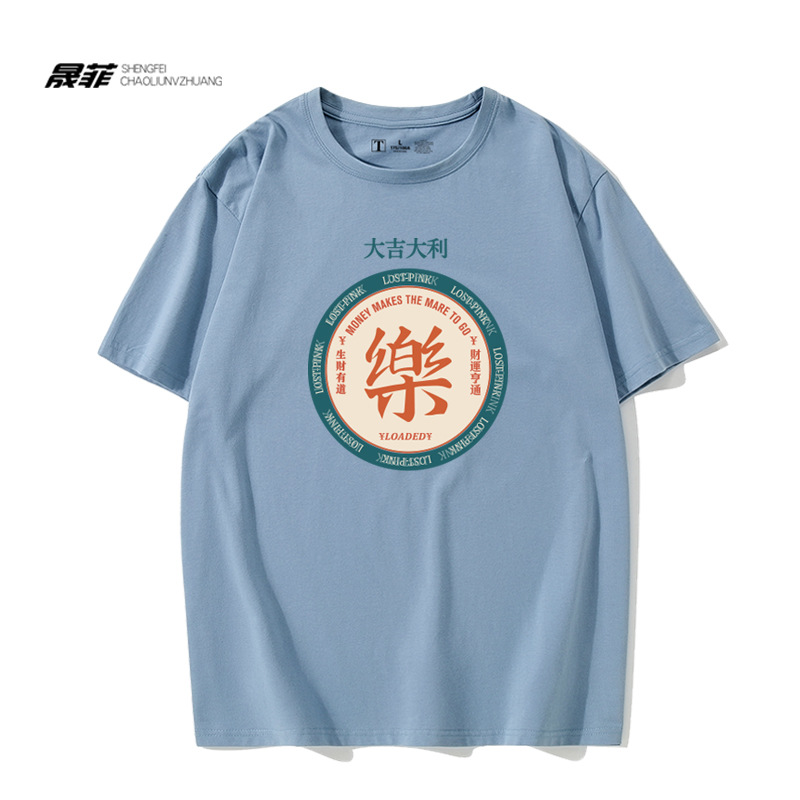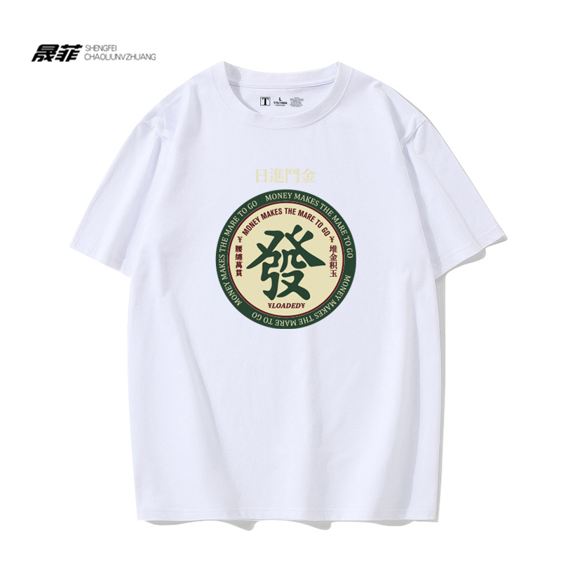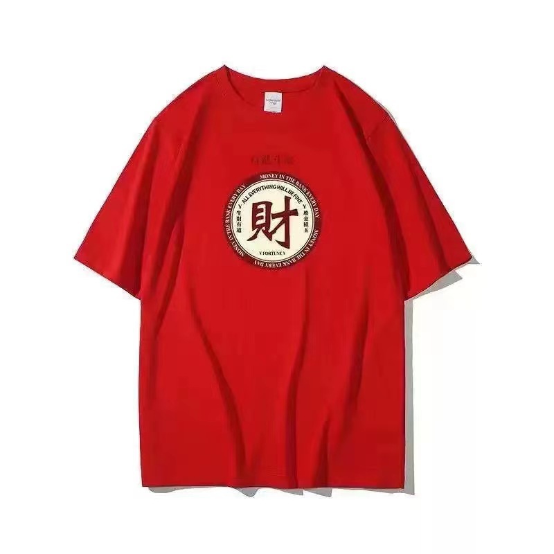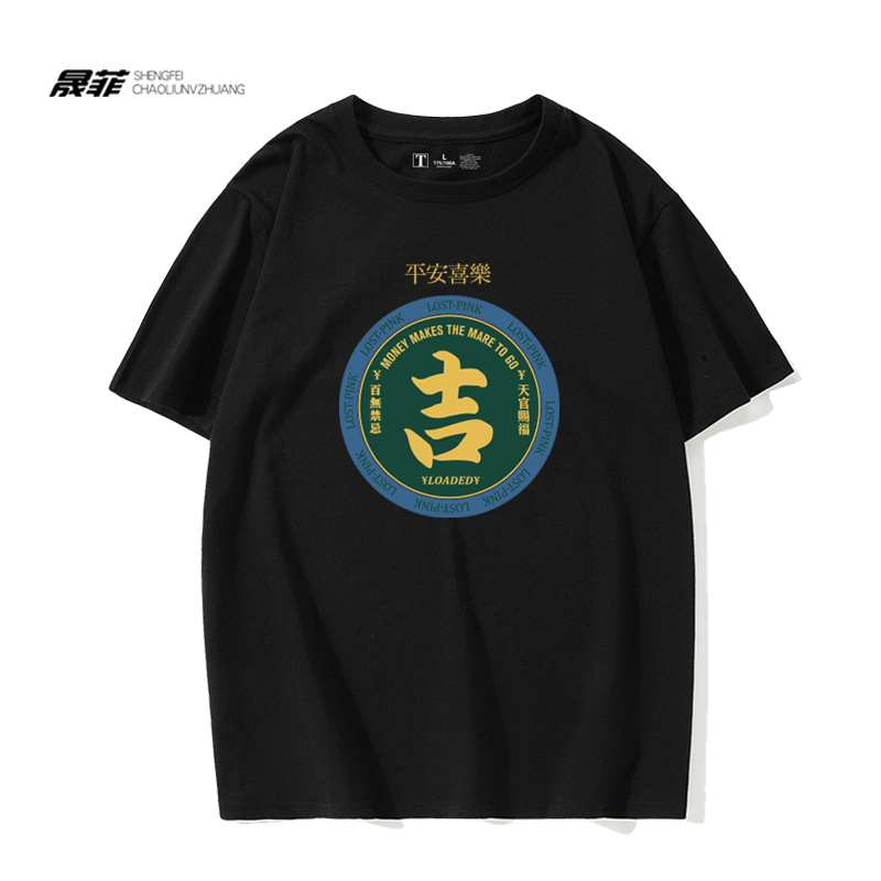 新款国潮短袖发财喜乐纯棉t恤女宽松大码情侣上衣闺蜜团队服装