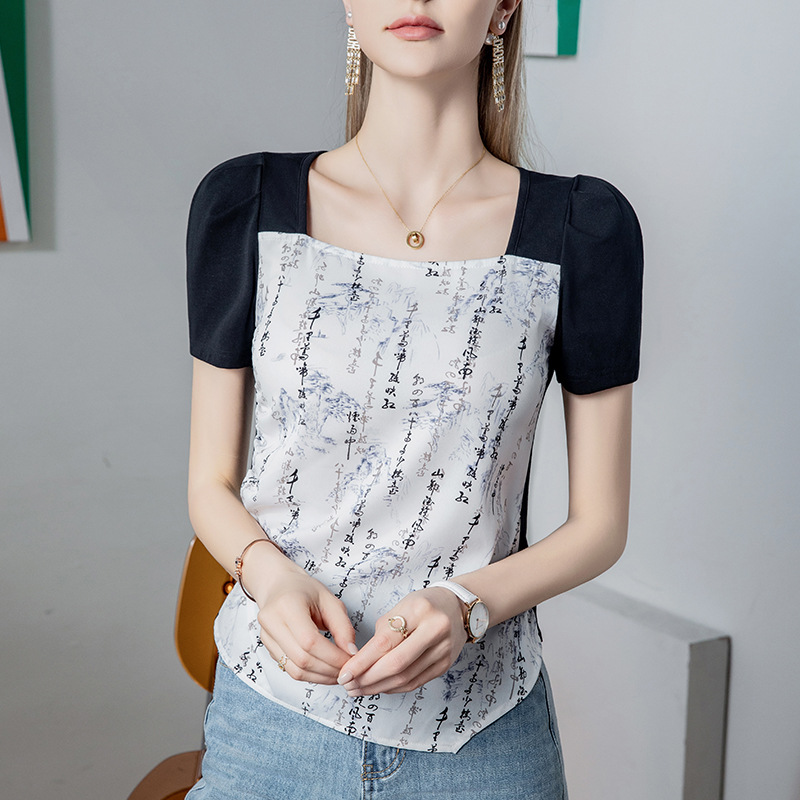 方领国风印花T恤女短袖夏季新款雪纺拼接女装泡泡袖上衣小衫