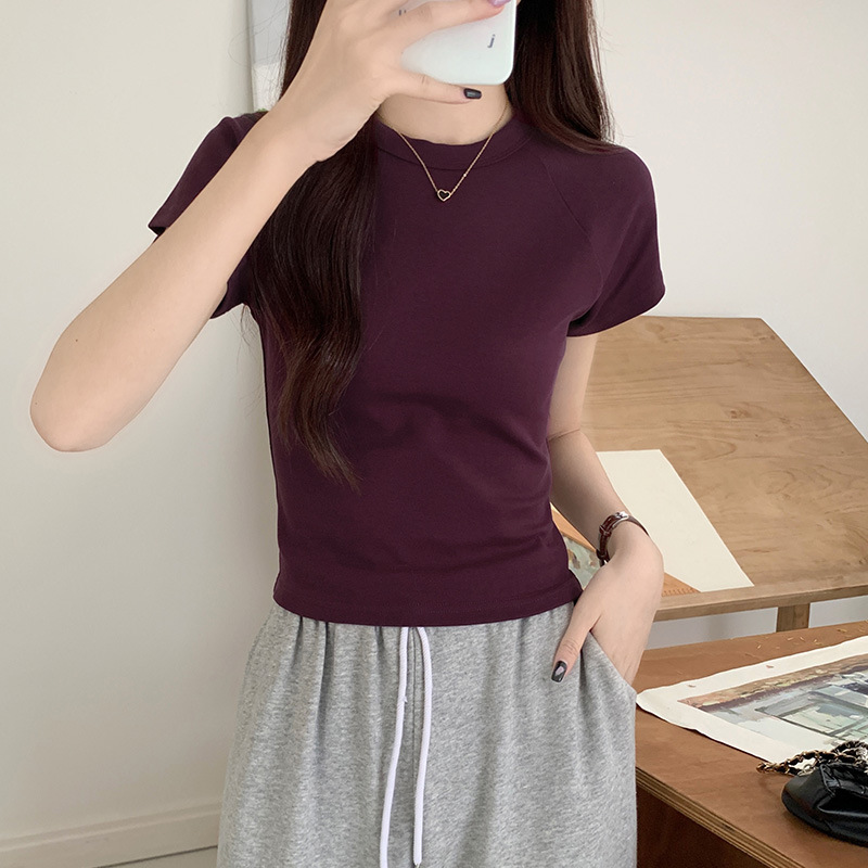 实拍紫色純棉短袖T恤女夏季修身显瘦圆领高级感正肩体恤上衣