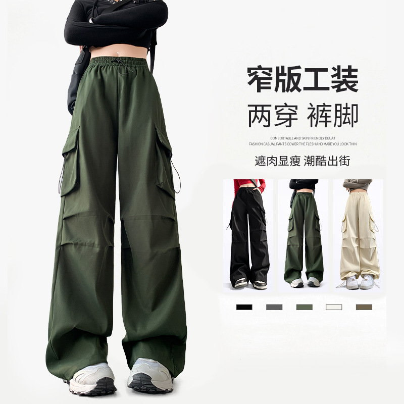 美式军绿色工装裤子女春秋2025新款登山冲锋裤宽松直筒阔腿运动裤