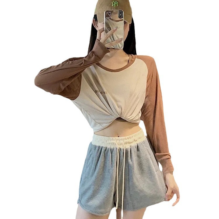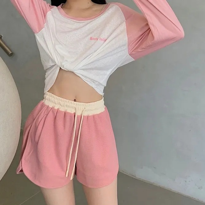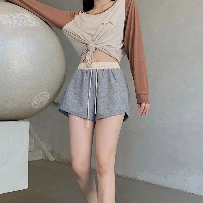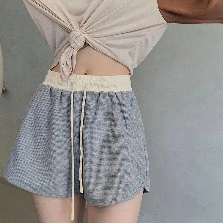 设计感高档小众华夫格运动短裤女拼色高腰宽松居家可外穿阔腿裤子