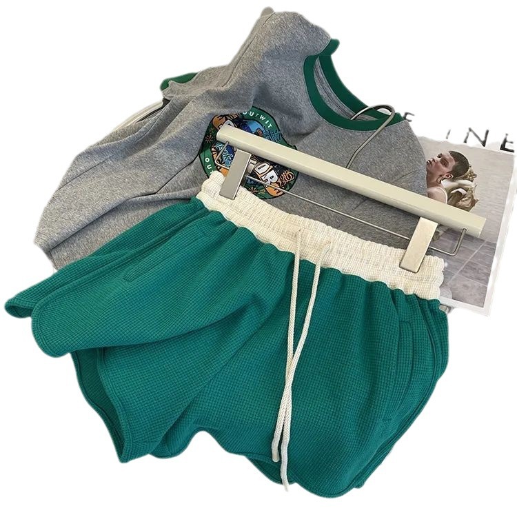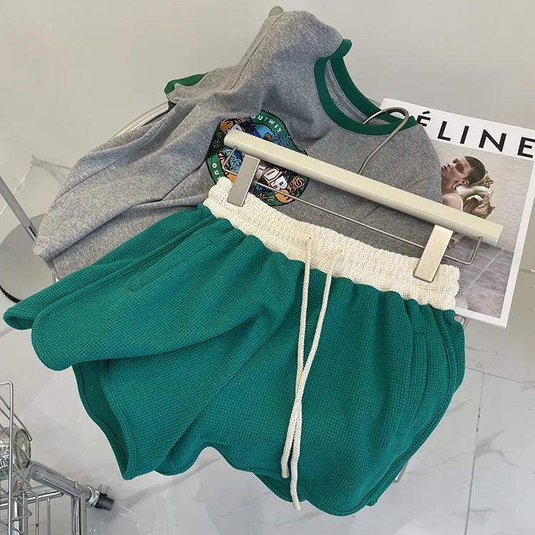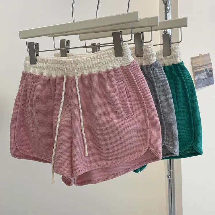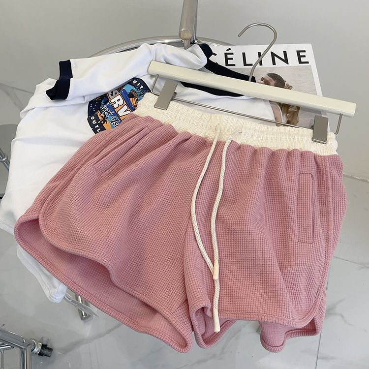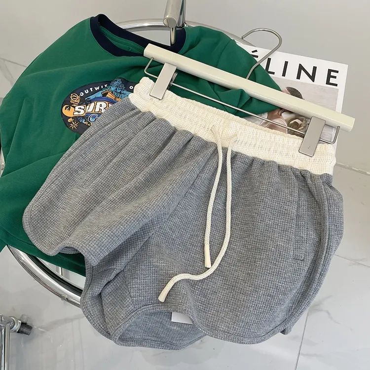 华夫格撞色松紧腰拼接运动短裤洋气高腰显瘦居家休闲阔腿热裤女