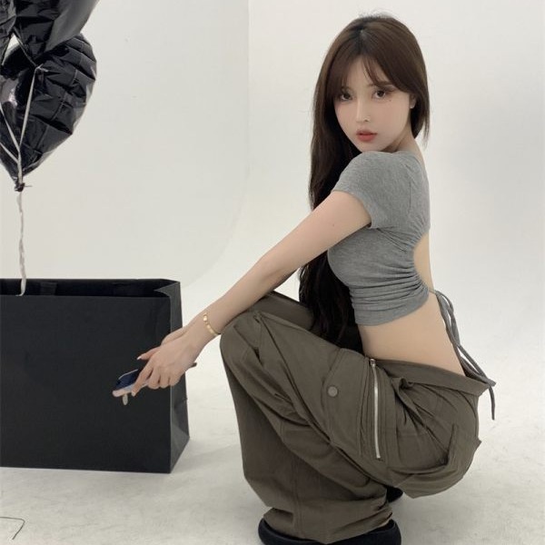 纯欲辣妹抽绳绑带性感短袖T恤女露背设计感独特别致短款紧身上衣