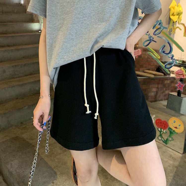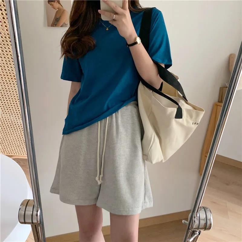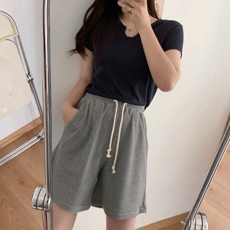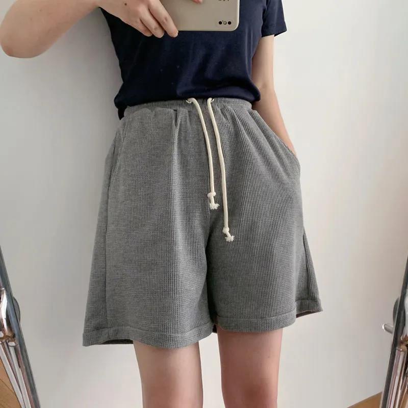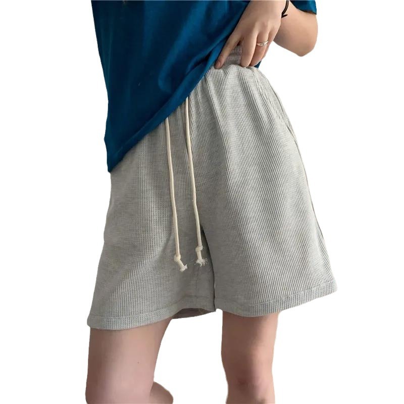 华夫格纹短裤女夏季透气抽绳系带松紧运动高腰阔腿五分裤学生裤子