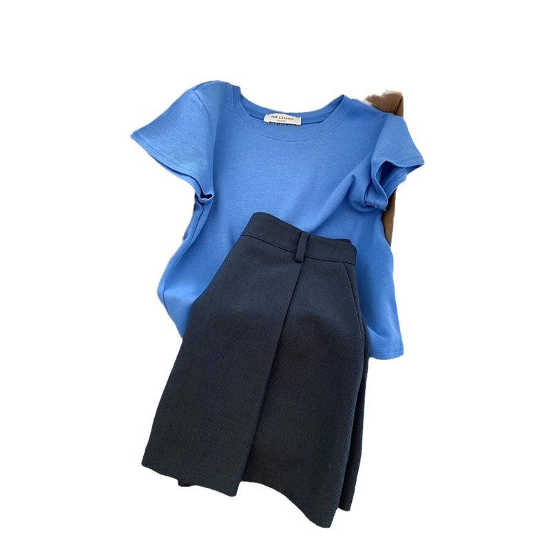 蓝色上衣+深灰色短裙