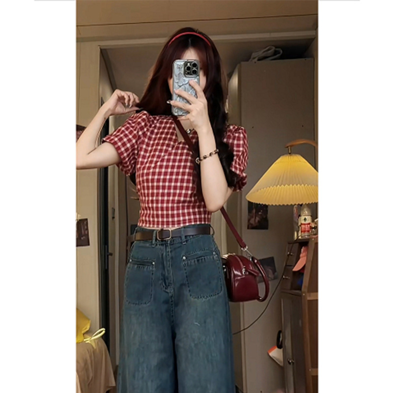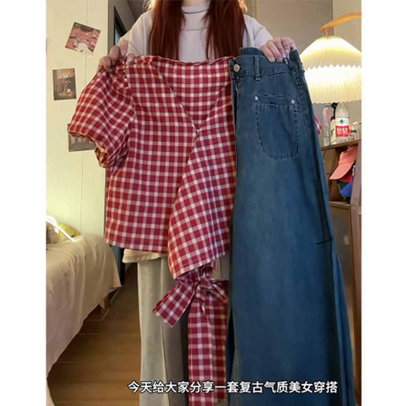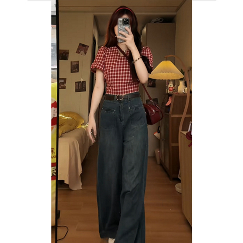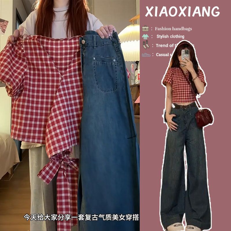 夏季学院风一整套女新款绑带格子短袖衬衫牛仔阔腿裤两件套装