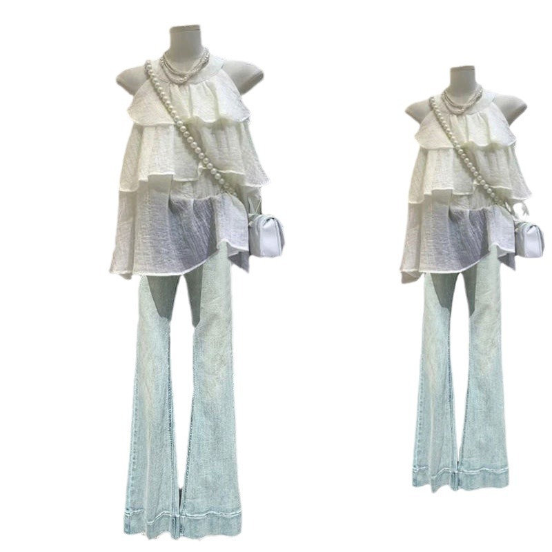 夏季洋气穿搭一整套女新款小众气质挂脖上衣显瘦牛仔裤两件套