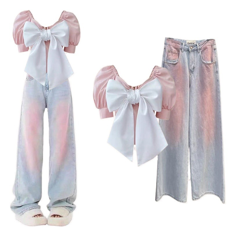 夏季奶呼呼穿搭一整套女新款蝴蝶结系带上衣百搭牛仔裤两件套