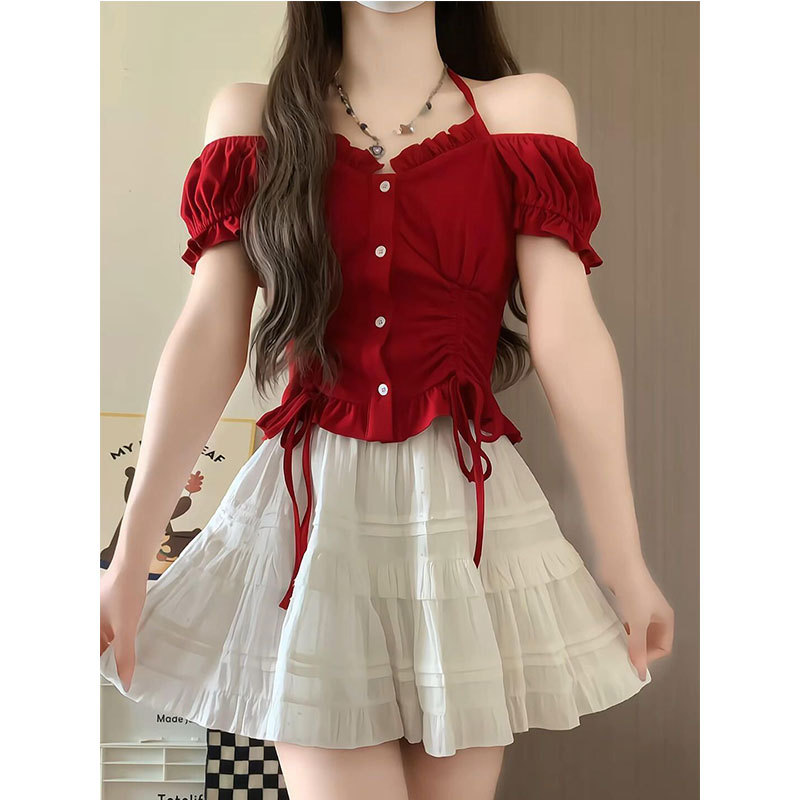 夏季温柔系穿搭女新款韩版奶系甜美露肩抽绳上衣短裙两件套