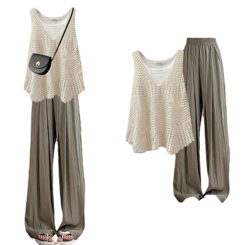 夏季慵懒风穿搭女新款时尚气质吊带上衣高腰阔腿裤子三件套