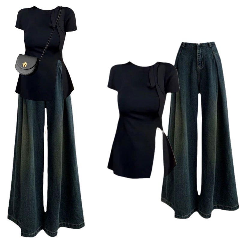 夏季一整套穿搭女新款气质减龄短袖上衣百搭牛仔微喇裤两件套