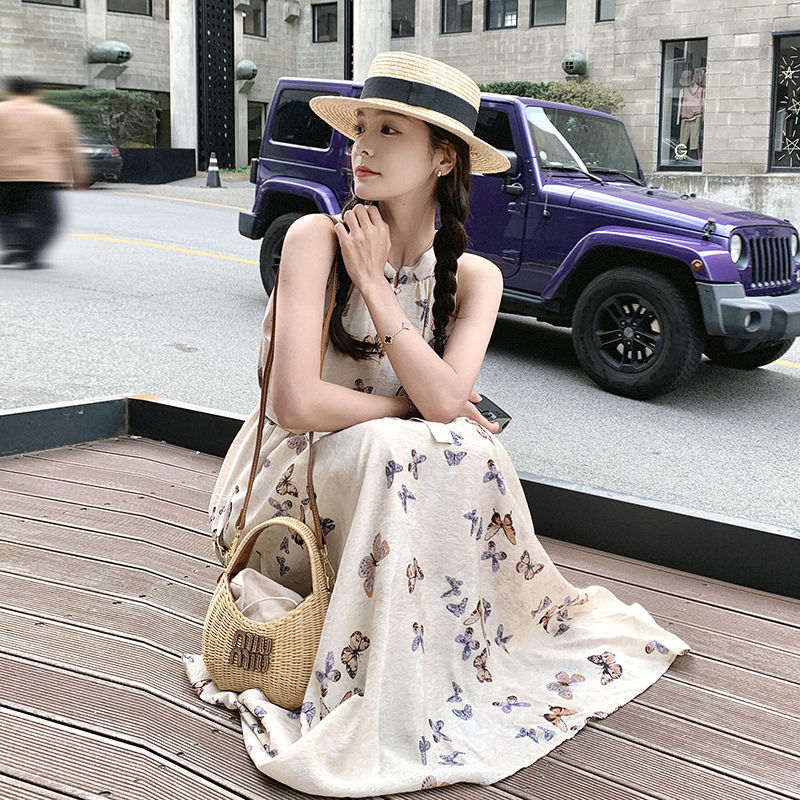 法式印花宽松蝴蝶碎花吊带裙夏季设计气质甜美减龄挂脖连衣裙