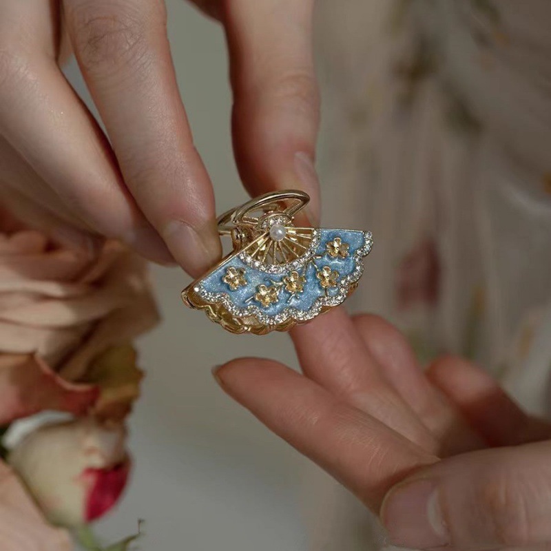 春季新中式釉蓝扇形小抓夹古风清冷感气质侧边夹珍珠轻奢鲨鱼夹女