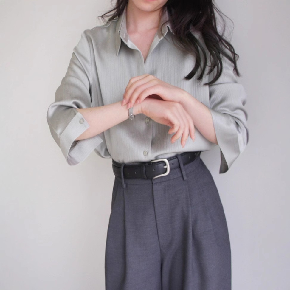 LOST AND FUOND灰调豆绿竖纹丝缎哑光暗纹长袖衬衫高级通勤质感女