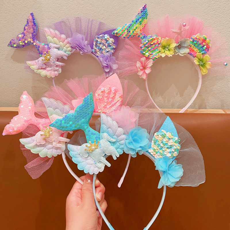 儿童头箍女童鱼尾贝壳发卡头饰女孩彩色亮片发箍公主花朵纱纱发饰