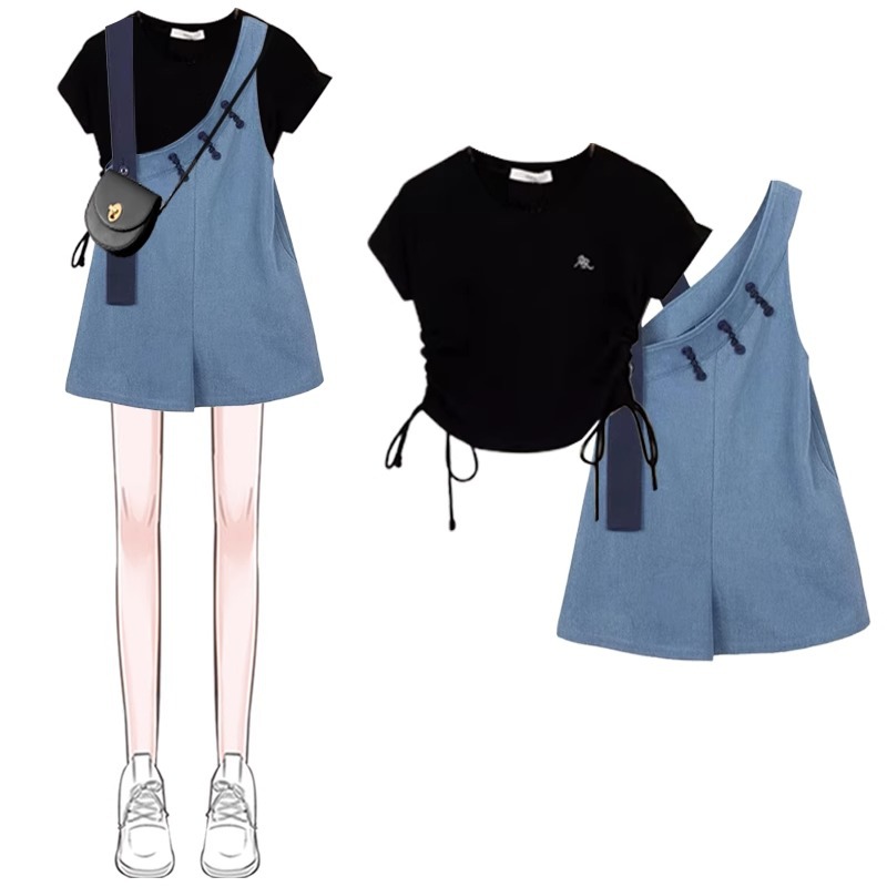 夏季轻熟风穿搭女新款设计感小众抽绳短袖T恤背带裤两件套装