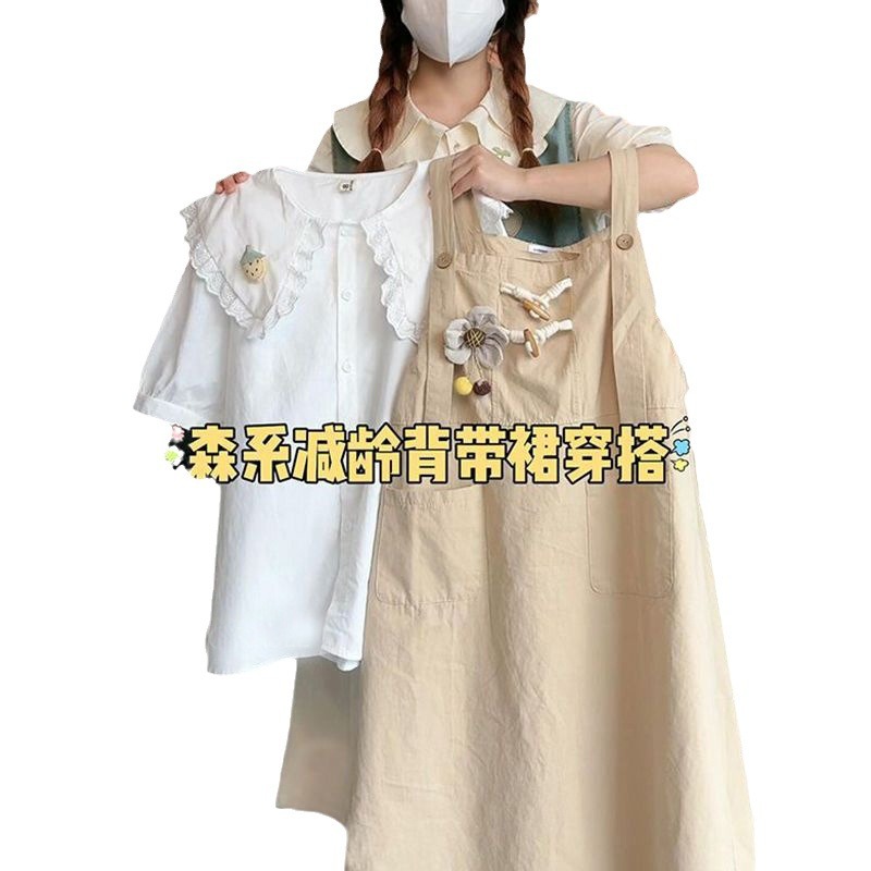 夏装搭配一整套新款胖mm时尚森系娃娃领衬衫背带连衣裙两件套