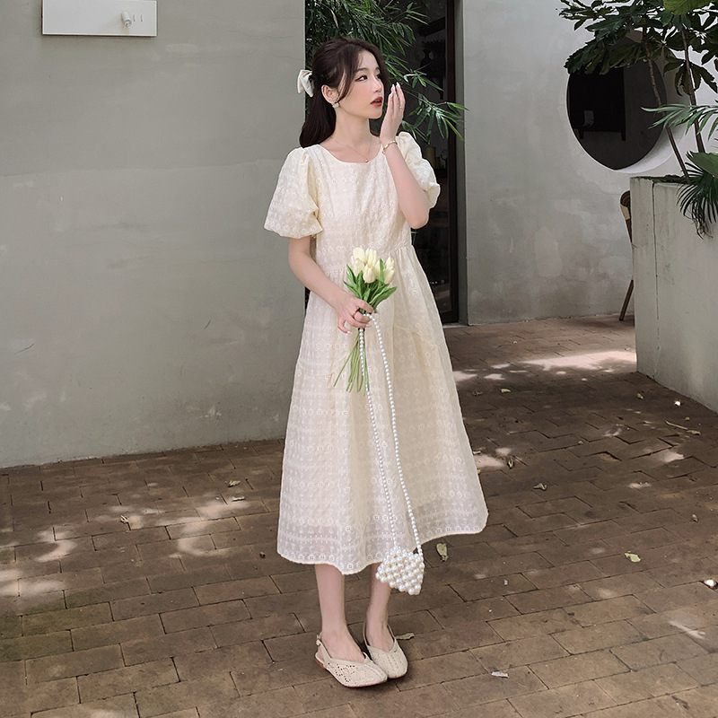 重工蕾丝面料泡泡袖茶歇法式白色圆领连衣裙子女夏季小众设计休闲