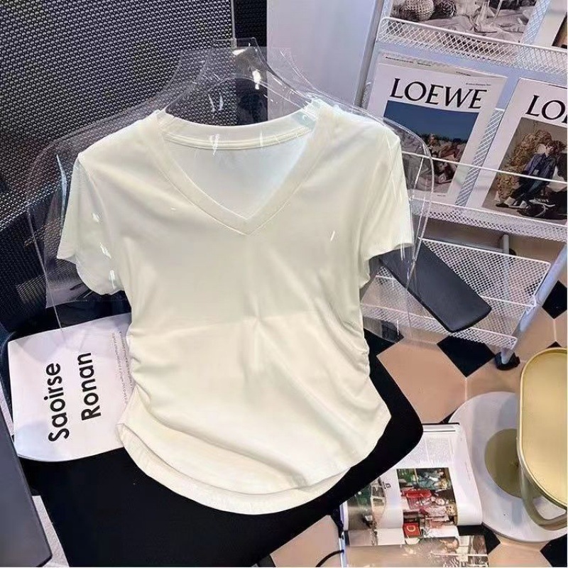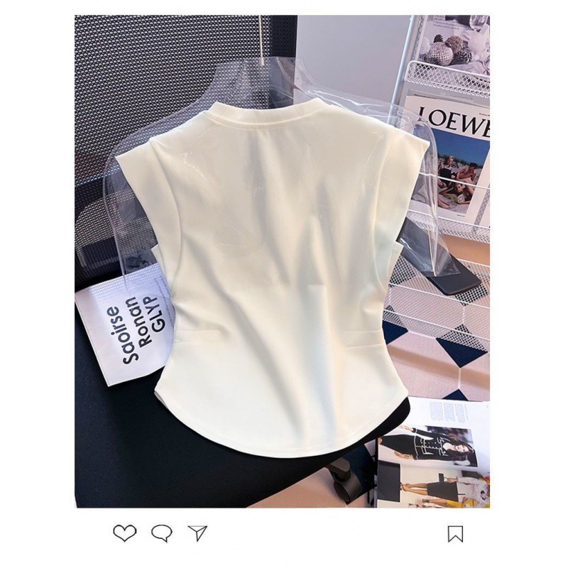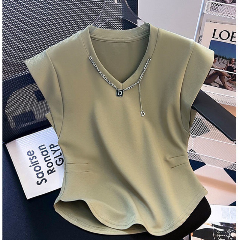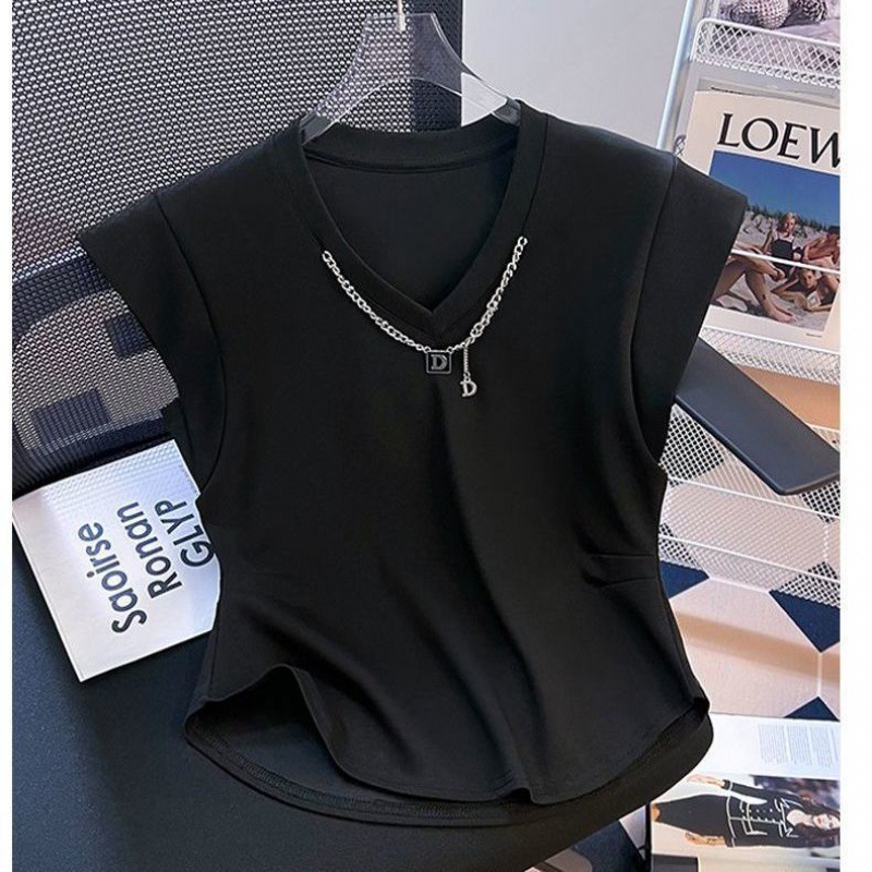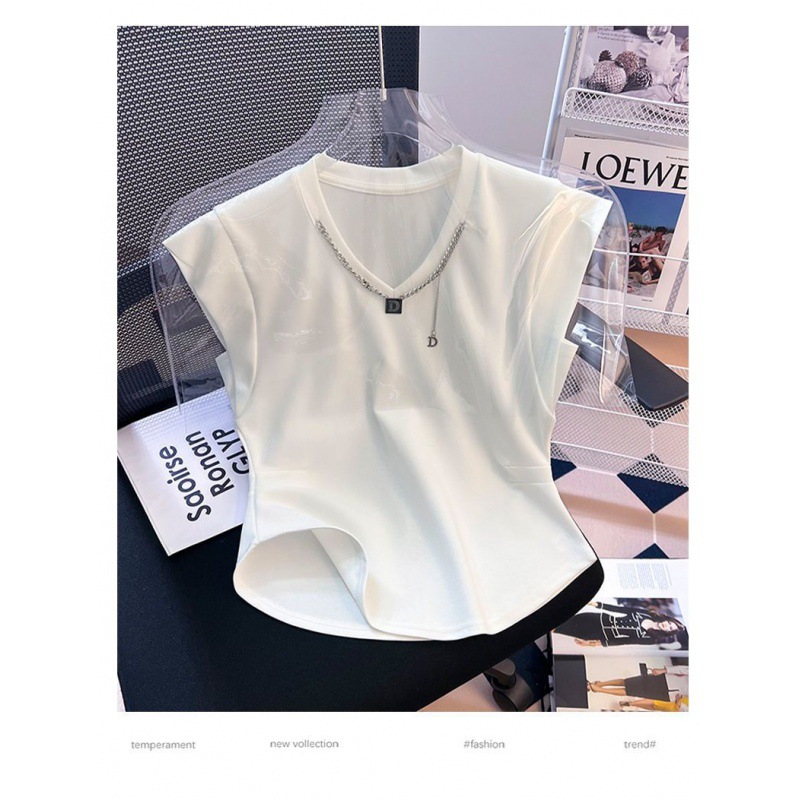 不规则小飞袖上衣女夏季下摆弧形短款体恤设计高级感链条短袖T恤