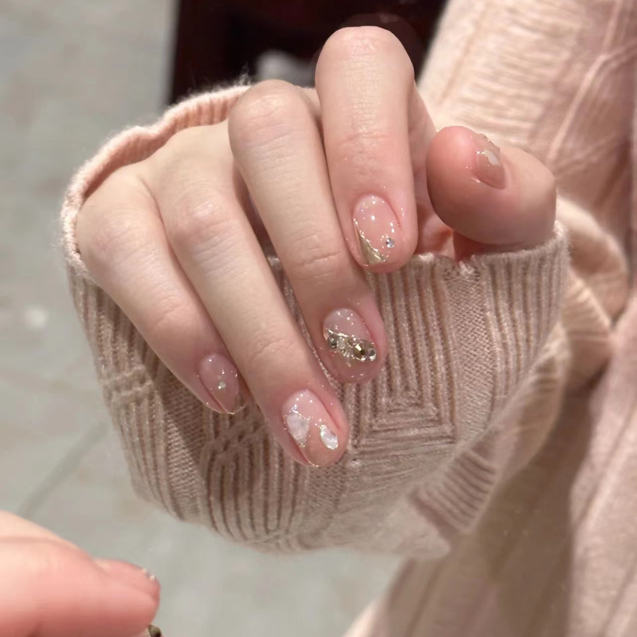 新款纯手工美甲穿戴甲裸色魔镜不规则贝壳胶镶钻短款学生爆款