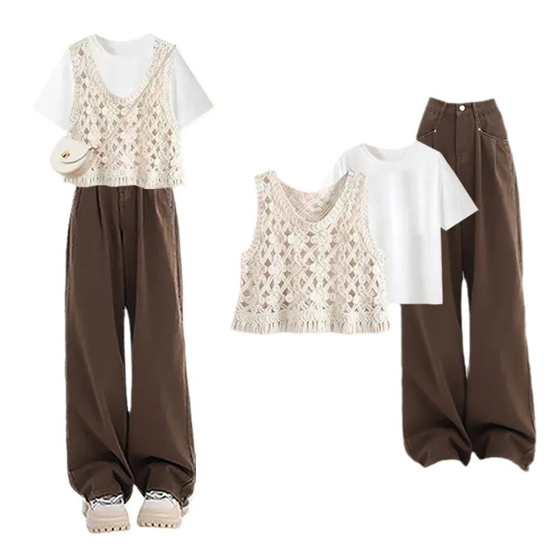 白色短袖+杏色上衣+咖色牛仔裤【三件套】
