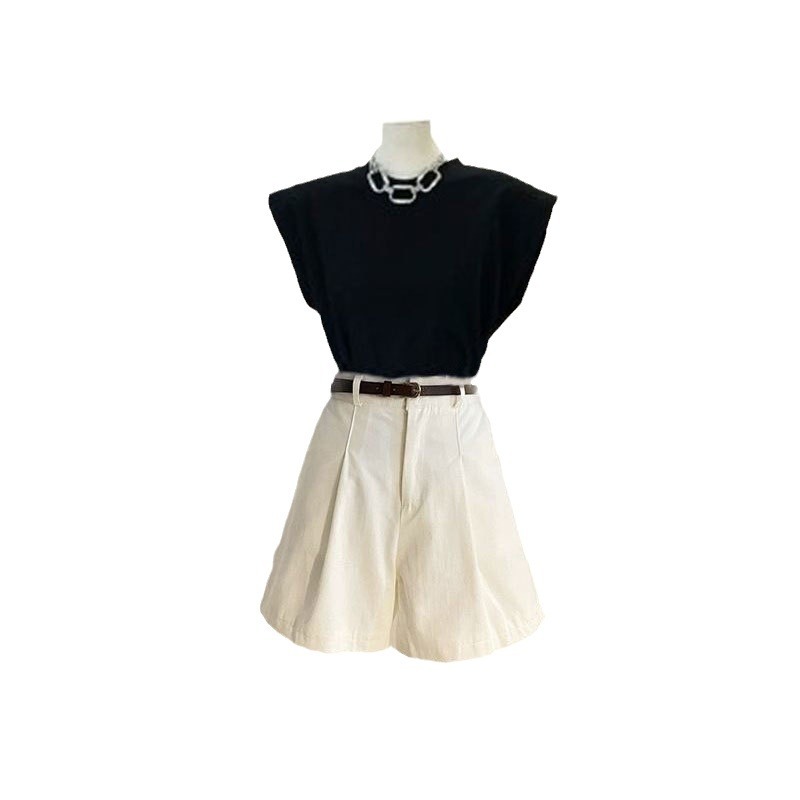 夏季港风穿搭一整套女新款小众设计简约上衣高腰短裤两件套装