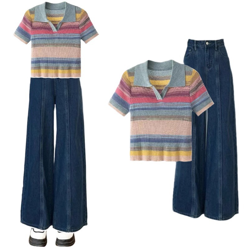 夏季洋气时尚穿搭一整天女新款别致独特条纹上衣牛仔裤两件套