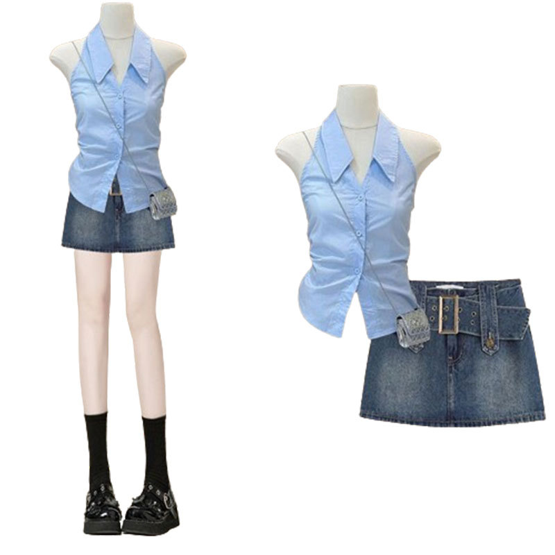 夏季气质轻奢穿搭女新款法式炸街时尚显瘦上衣牛仔短裙两件套