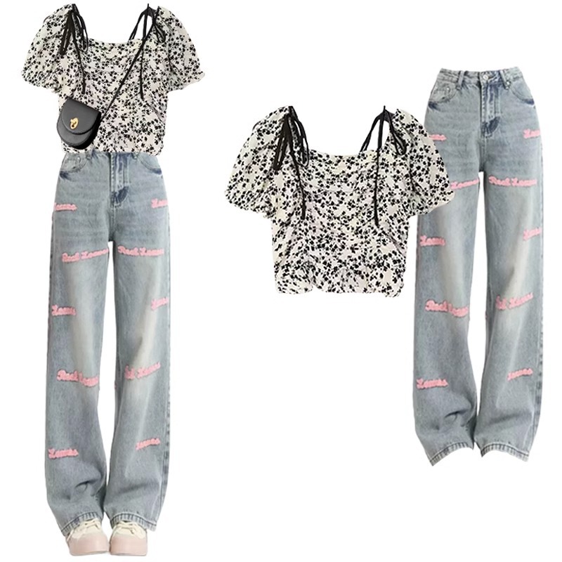 夏季茶系穿搭一整套女新款法式高级感碎花上衣牛仔裤两件套装