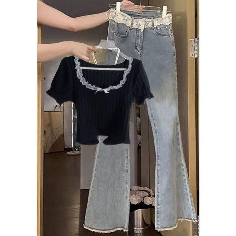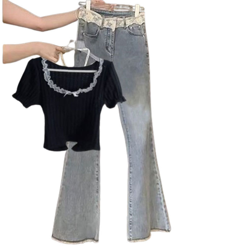夏季时尚炸街穿搭女新款轻熟风百搭短袖T恤高腰牛仔裤两件套