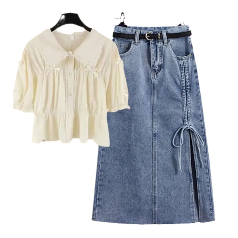 夏季大码时尚套装女新款洋气减龄娃娃领短袖上衣牛仔裙两件套
