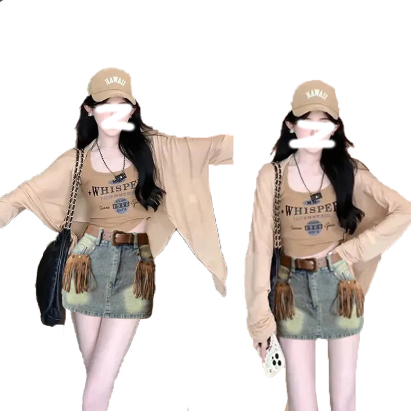 夏季时尚穿搭一整套女新款美式辣妹背心防晒开衫半身裙三件套