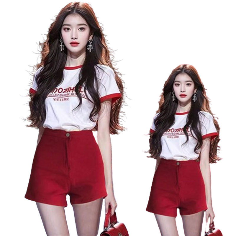 夏季辣妹炸街穿搭女新款甜酷显瘦短袖上衣高腰牛仔短裤两件套
