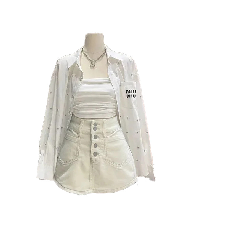 夏季温柔穿搭女新款韩版时尚显瘦背心休闲百搭衬衫短裙三件套