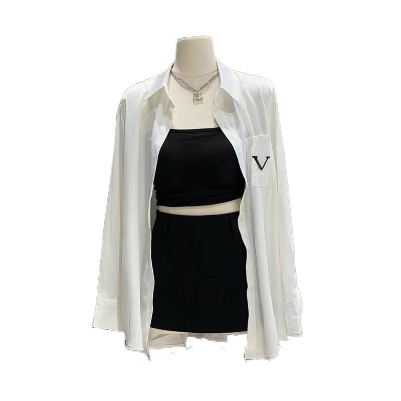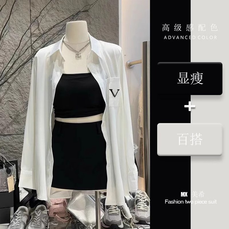 夏装搭配一整套新款大码韩版时尚宽松衬衫黑色吊带短裙三件套