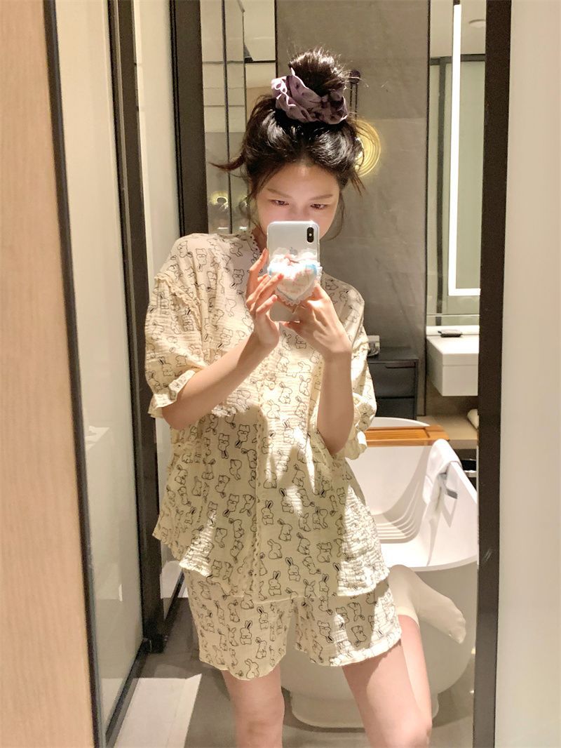 ins风可爱卡通睡衣夏季新款日系网红少女蕾丝开衫短袖家居服套装