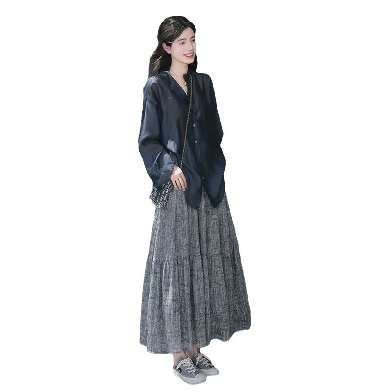 夏季一整套穿搭女新款韩版茶系设计感衬衫高腰半身裙两件套装