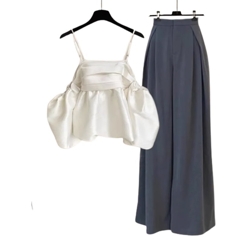 夏季洋气减龄套装女新款韩系chic一字肩吊带上衣阔腿裤两件套