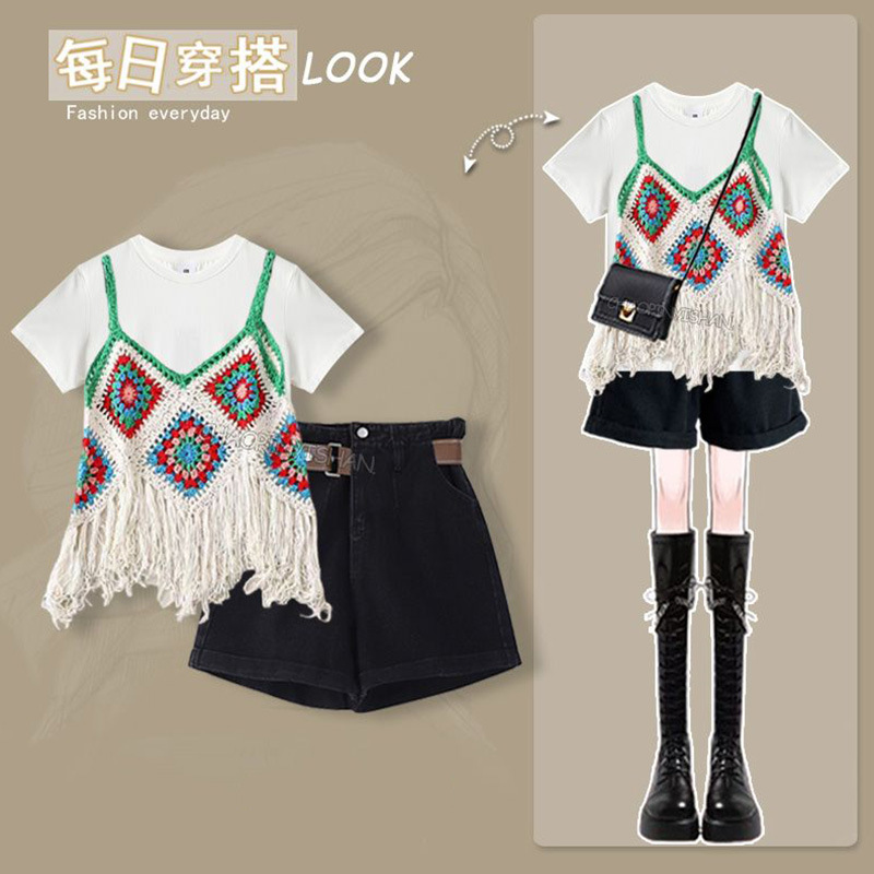 夏季盐系轻熟套装女新款百搭短袖吊带马甲牛仔短裤三件套