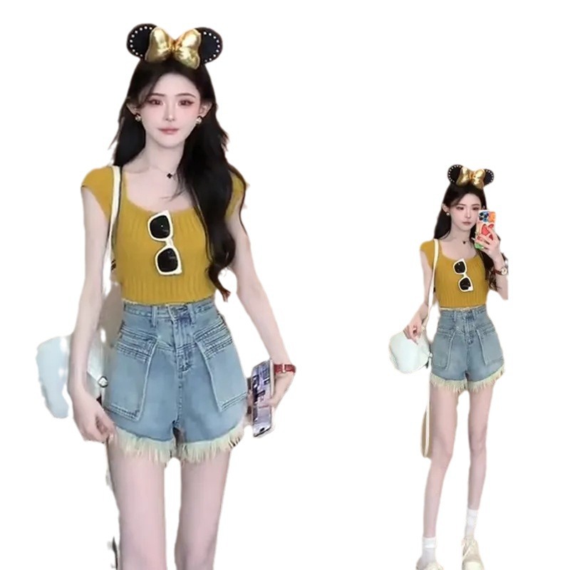 夏季纯欲风穿搭女新款高级感修身显瘦短袖百搭牛仔短裤两件套