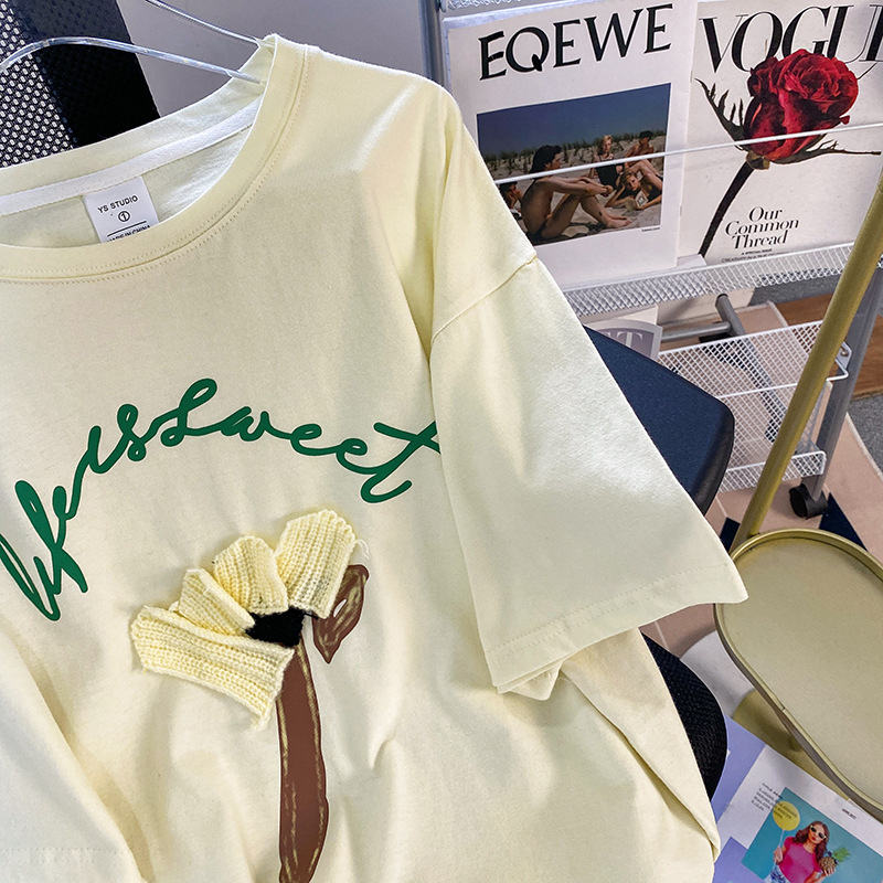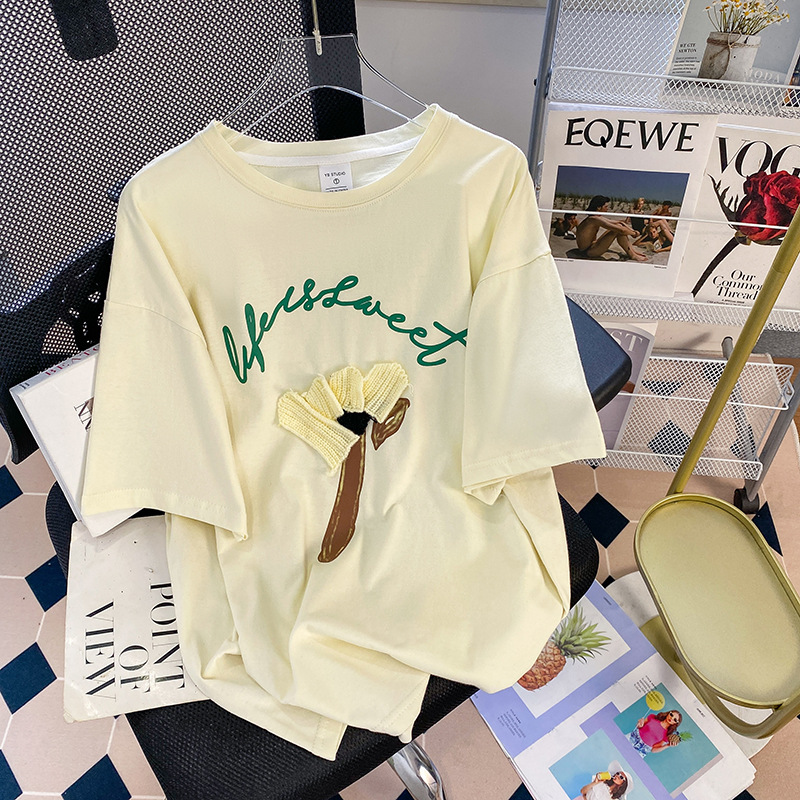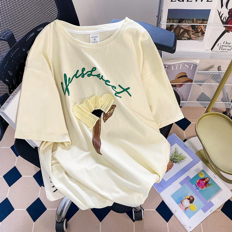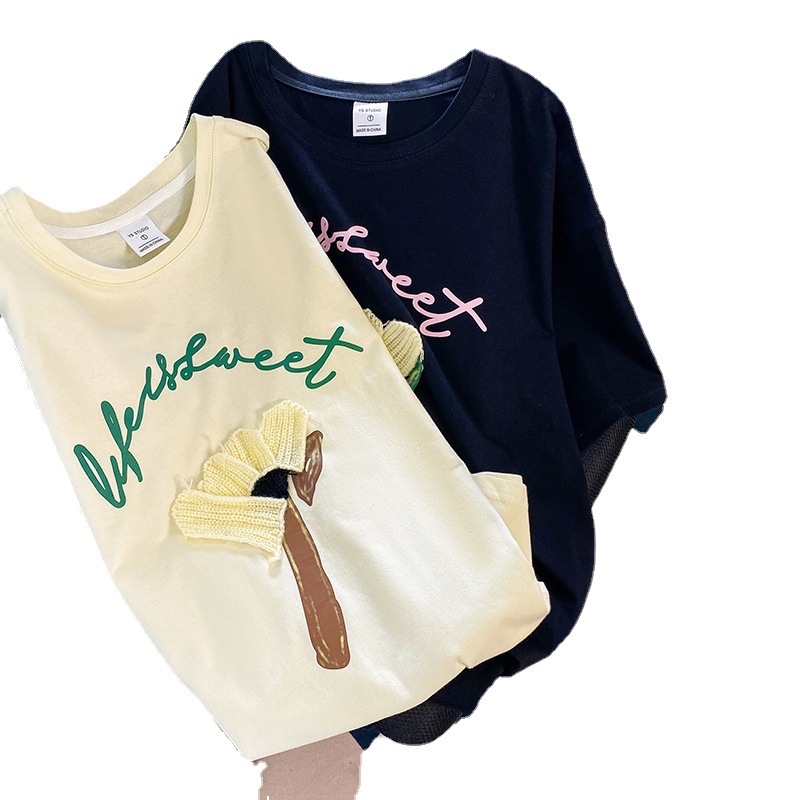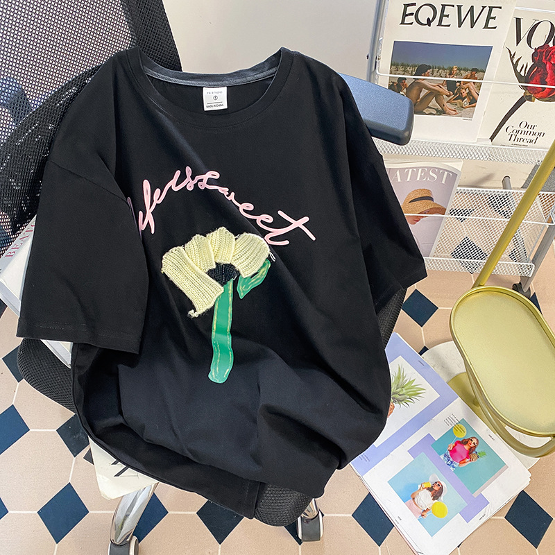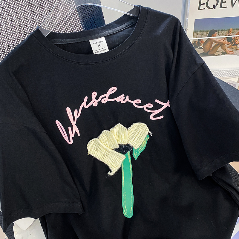高级感独特立体小花朵短袖t恤女夏季宽松别致韩版正肩体恤上衣ins