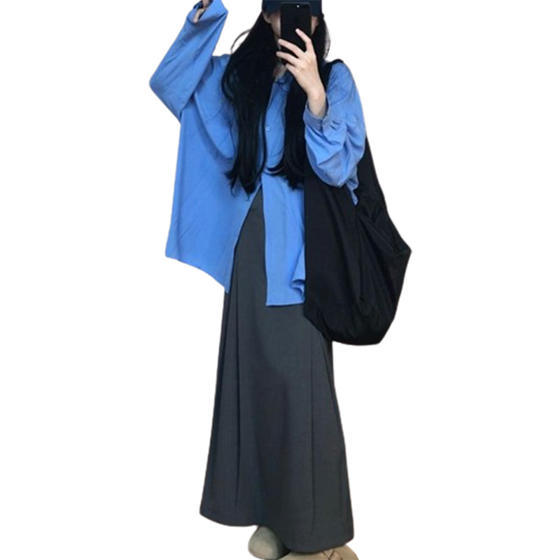 温柔穿搭女新款韩版时尚宽松克莱因蓝衬衫高腰半身裙两件套装