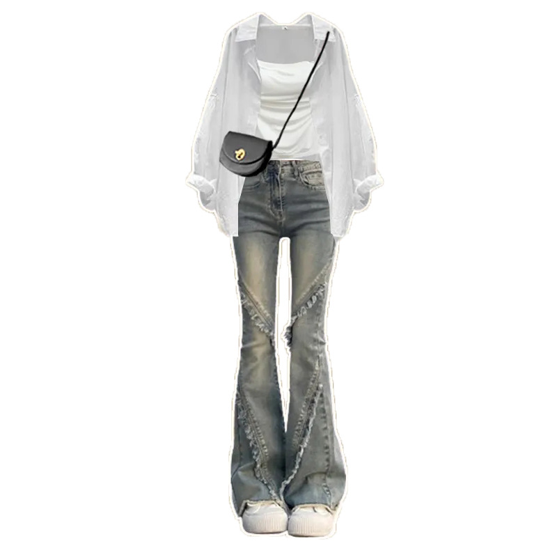 夏季温柔系穿搭女新款韩版时尚宽松衬衫吊带牛仔微喇裤三件套