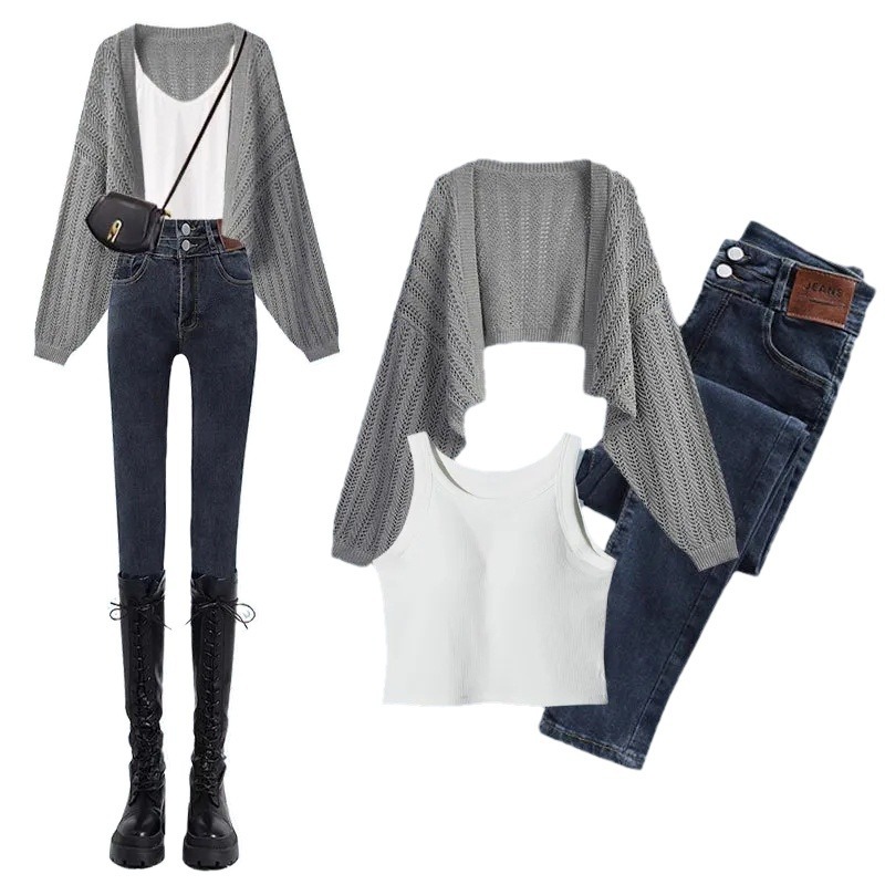夏季温柔系穿搭女新款韩版时尚吊带背心百搭开衫牛仔裤三件套