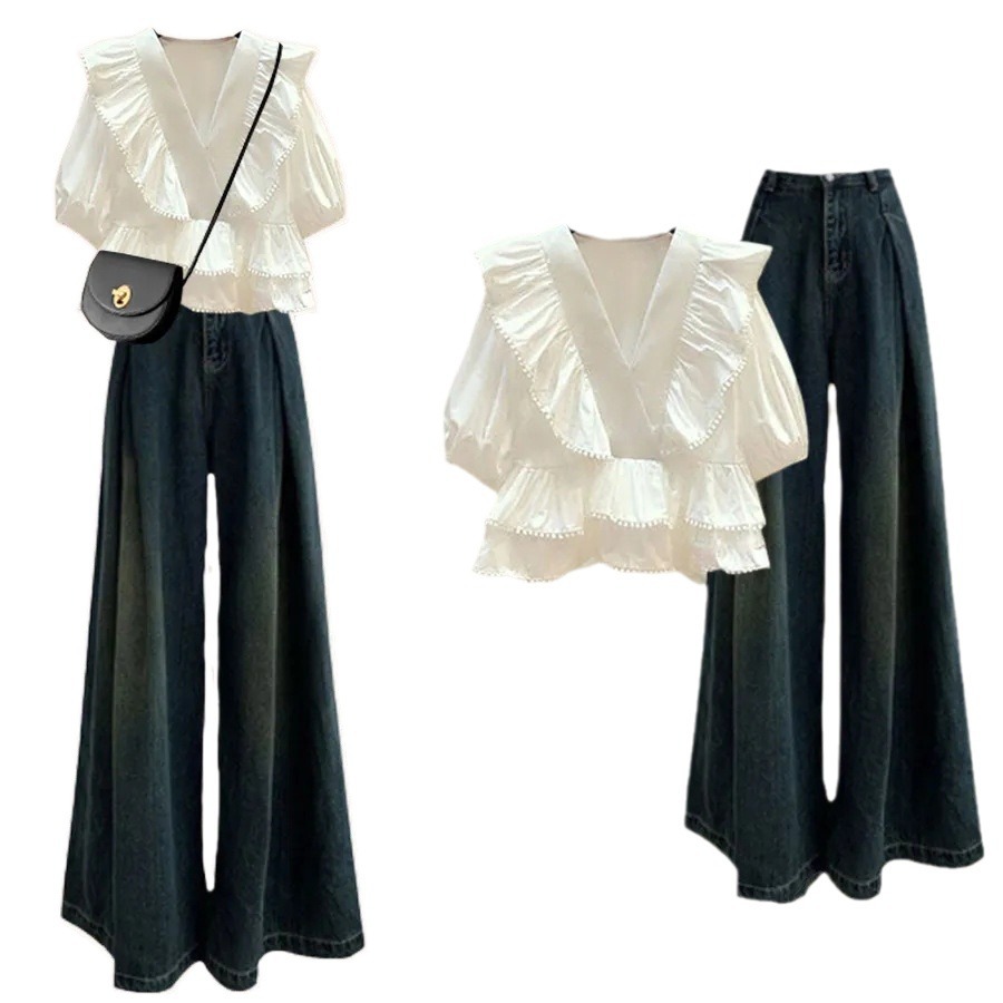 大码女装夏季套装女新款荷叶边衬衫短袖高腰牛仔长裤两件套