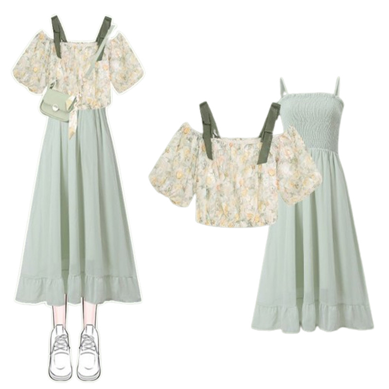 夏天搭配一整套新款胖mm温柔系一字露肩上衣吊带连衣裙两件套