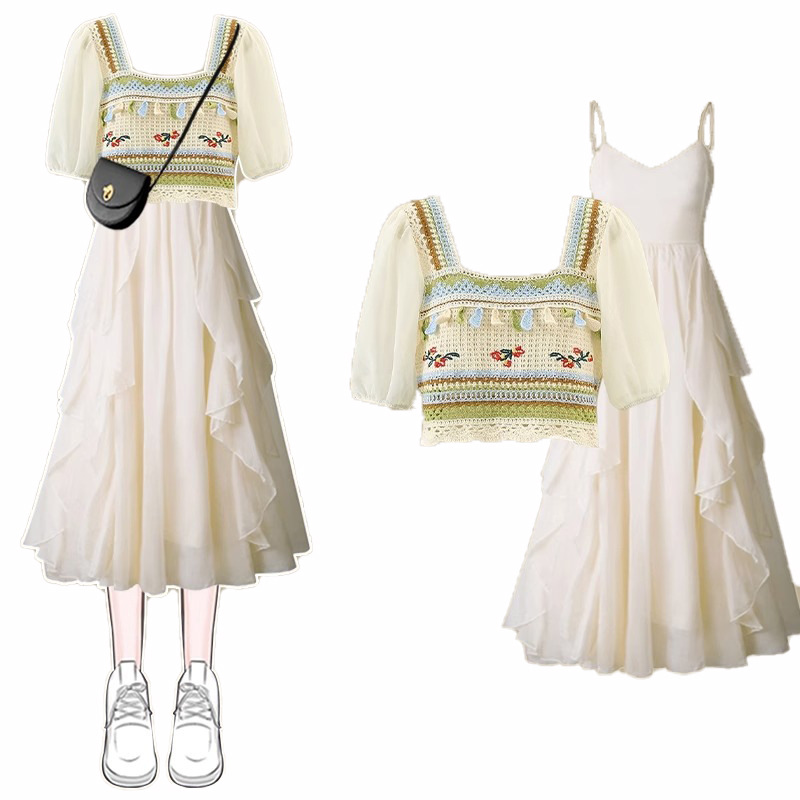 夏季时尚减龄套装女新款波西米亚风百搭方领上衣吊带裙两件套